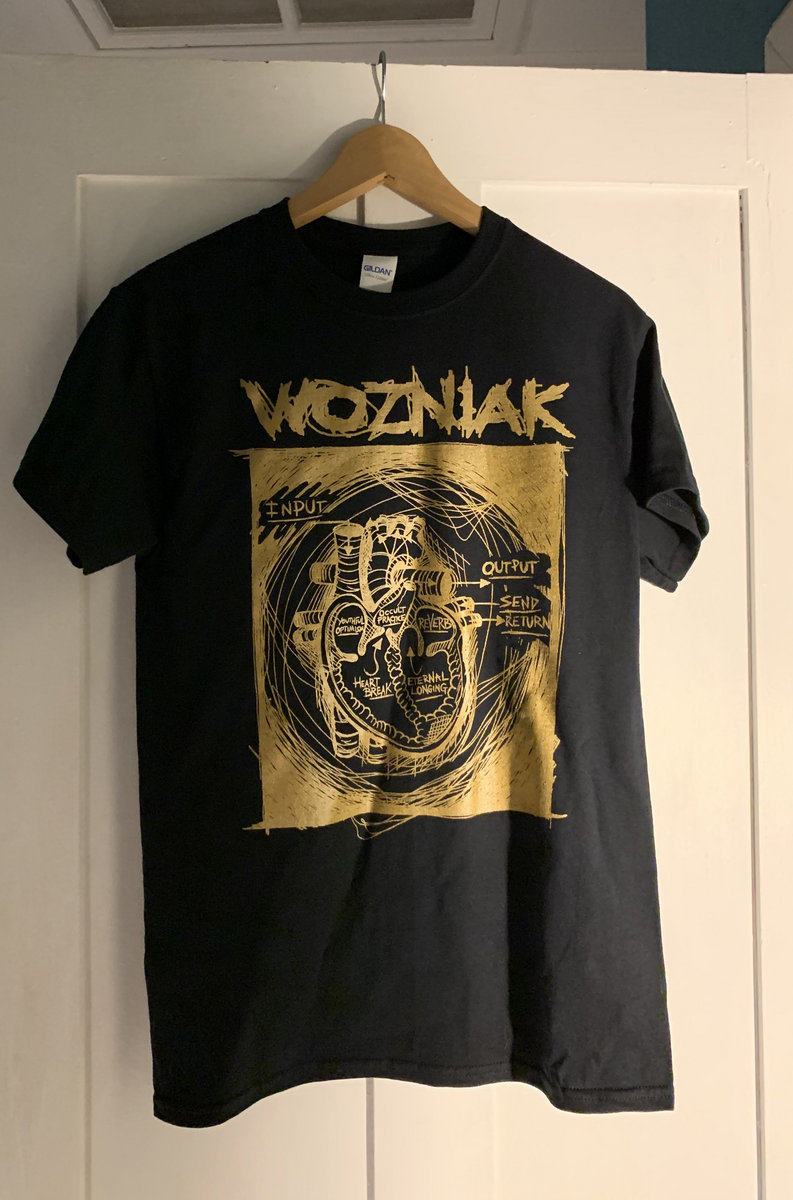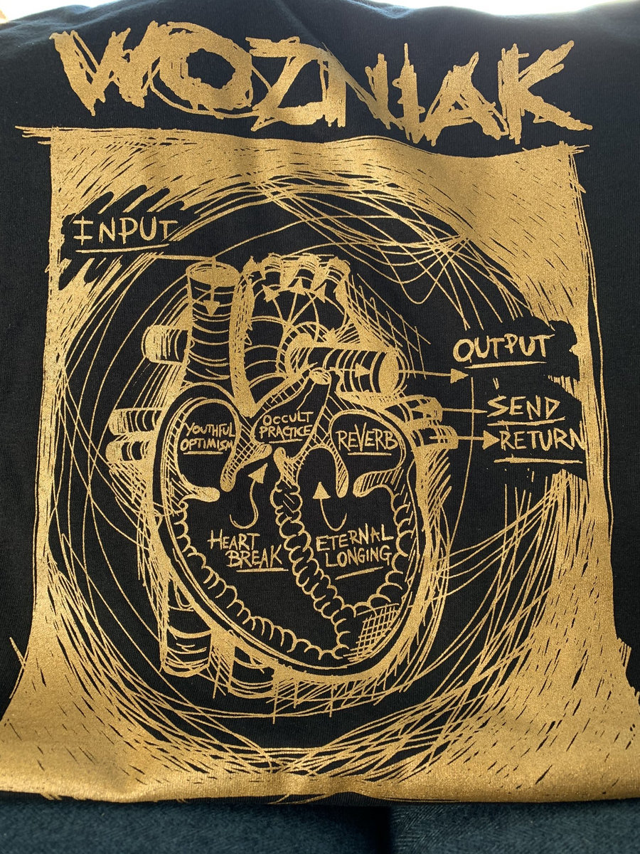Our new t-shirt, designed by our very own bass maestro, Elvis Valentine, in collaboration with celebrated Edinburgh tattoo artist Chris Thomson. The image is an anatomically correct* rendering of the effect Wozniak has on a person's heart, rendered in a beautiful metallic gold finish.